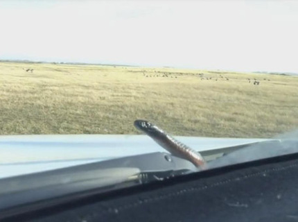 Шокированная от высокой скорости змея на капоте перепугала водителя: видео