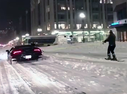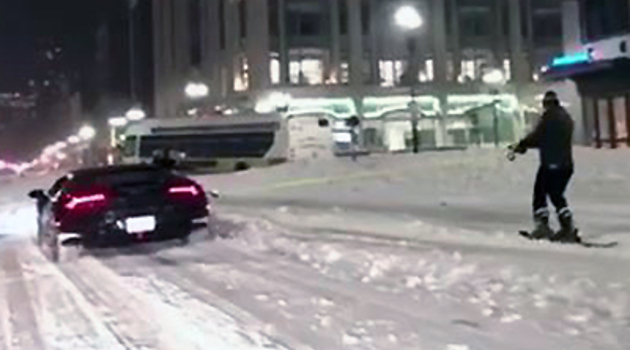 Видео: Лыжник-зацепер развлек публику на пару с Lamborghini
