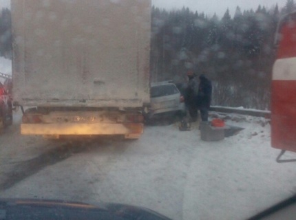 На М-8 образовалась пробка из-за ДТП легковушки и грузовика