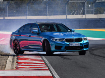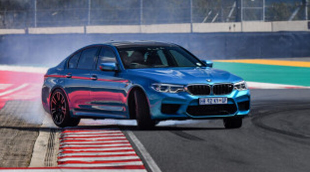 Дрифт BMW M5 F90 в Snapper Rocks Blue в Южной Африке