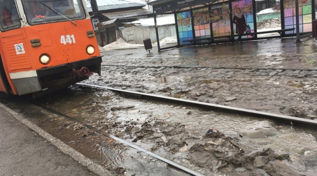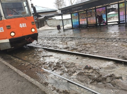 «Сильно пахнет канализацией»: из-за засора в Мотовилихе затопило трамвайные пути