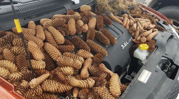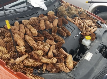 Белки спрятали в машине 22 килограмма сосновых шишек