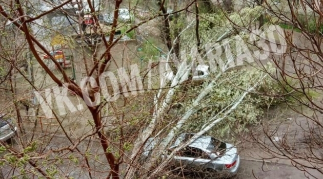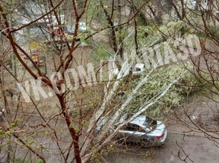 Из-за сильного ветра в Астрахани на автомобиль упало дерево