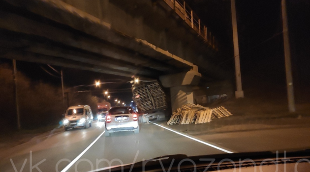 Под мостом на Южной окружной застрял грузовик