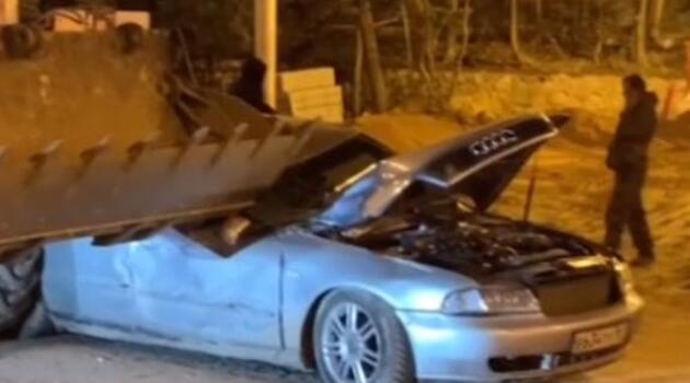 Водитель трактора в Севастополе разозлился на шофера иномарки и обрушил ковш на его автомобиль