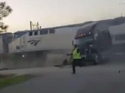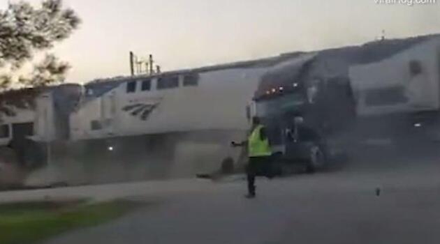 Водитель застрявшего на рельсах трейлера, чудом избежал столкновения с поездом