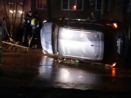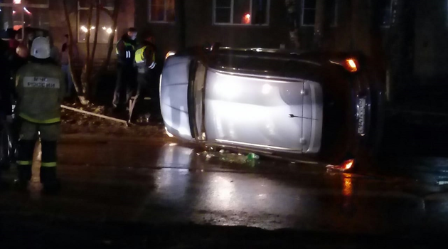 Иномарка протаранила столб и перевернулась на улице Корнилова