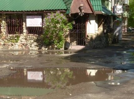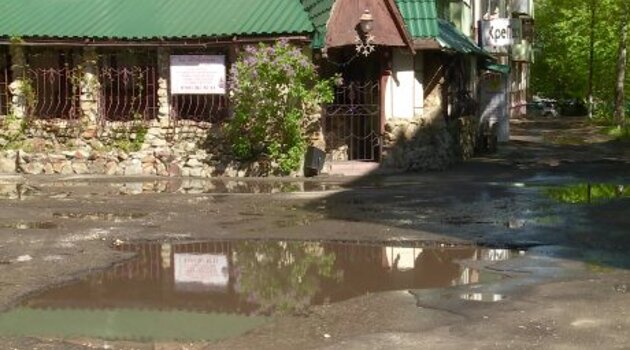 Почти на всю ширину дороги во дворы на ул. Мира растеклась лужа