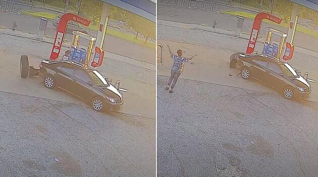 Отлетевшее от грузовика колесо долго катилось и лишило заднего бампера легковушку на АЗС - видео