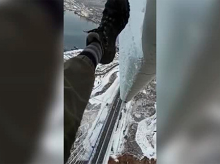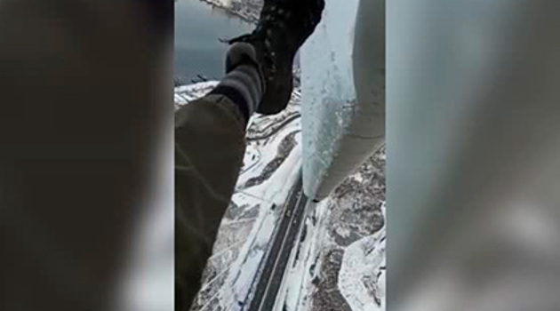 Альпинист с 300-метровой высоты показал на видео очистку Русского моста от льда