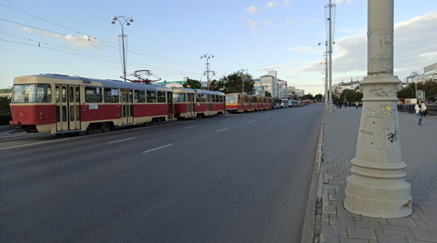 В центре Екатеринбурга трамваи встали в огромную пробку из-за ДТП