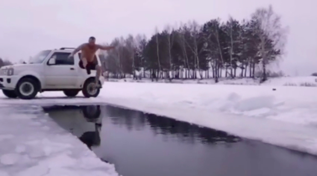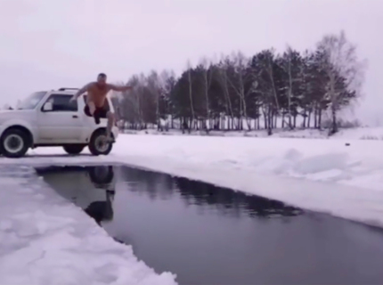 Житель Подмосковья прыгнул из машины прямо в прорубь и попал на видео
