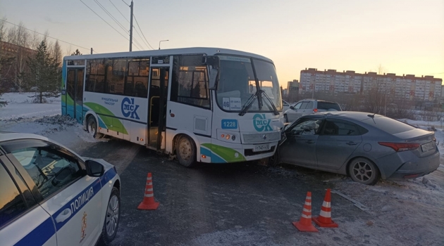 В Омске пассажирский автобус выехал на «встречку» и врезался в иномарку