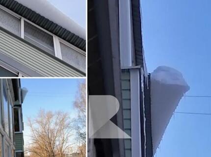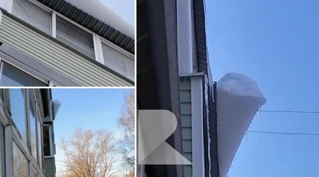 Опасная льдина свисает с крыши на улице Станкозаводской в Рязани