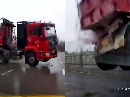 Грузовик без тормозов проломил забор и упал с моста в КНР