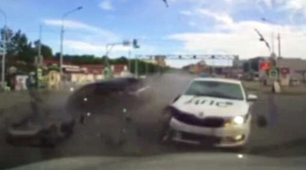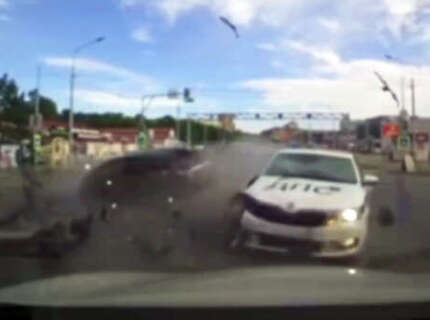 На видео попал момент жесткой аварии со служебной машиной ДПС в Приморье