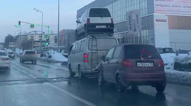 В Казани водитель перевозил хетчбэк Daewoo на крыше минивэна