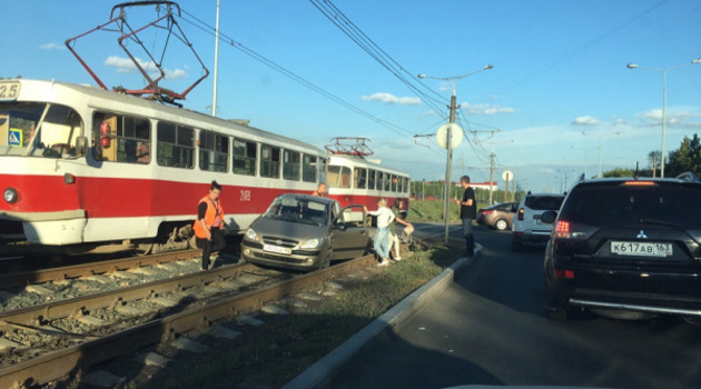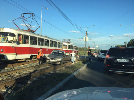На Ташкентской трамвай протащил иномарку и выкинул ее на встречку