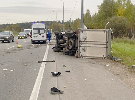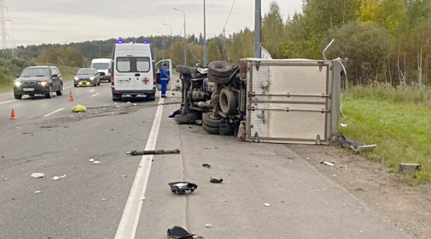 Грузовик въехал на ограждение и перевернулся на МКАД