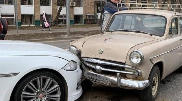 Столкновение эпох: «Москвич» врезался в Jaguar XJ в Москве