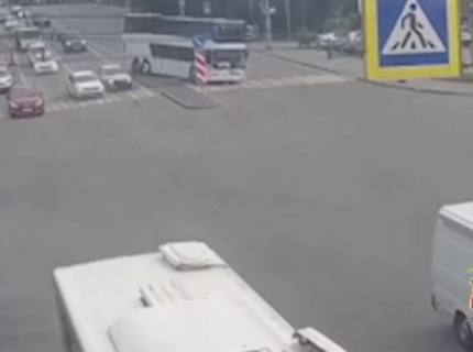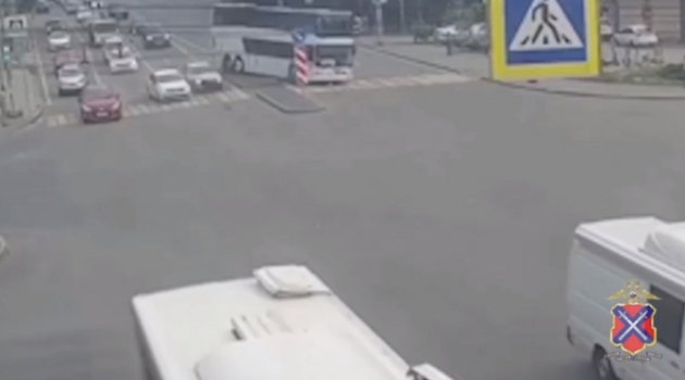 На видео попал момент ДТП с двухэтажным автобусом в центре Волгограда