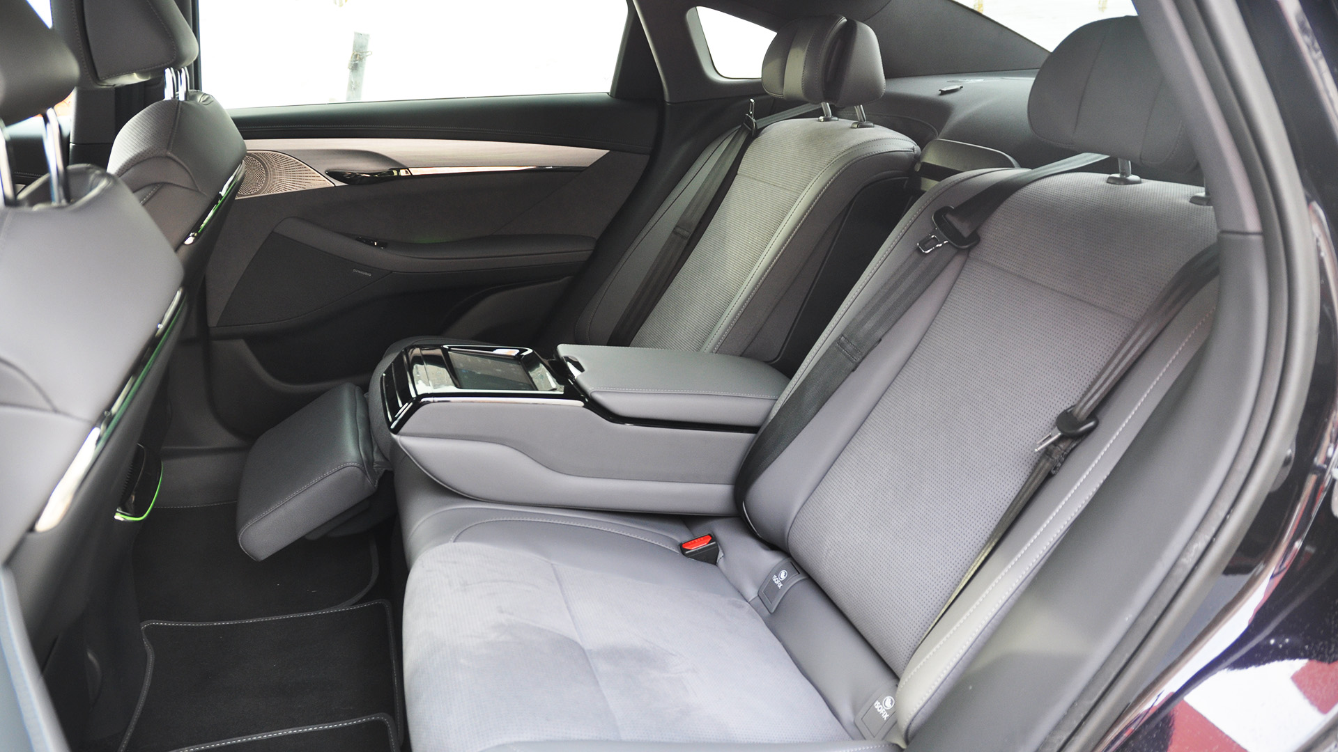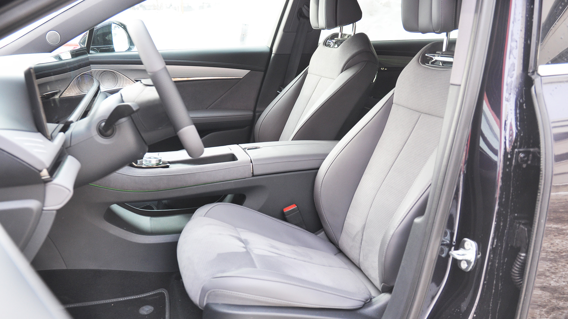 Внутри — как в рубке звездолёта. Три 12,3-дюймовых экрана сплошной лентой растянулись от двери до двери: приборы, мультимедиа, кино для переднего пассажира. Четвертый дисплей (нижний) заведует климатом и зеркалами. Пятый спрятан в подлокотнике заднего дивана. Граней на руле хватило бы на бриллиант, шайба селектора — «хрустальная», отделка — кожа и замша Dynamica. Визуально — настоящий премиум. На ощупь тоже, если не цепляться к мелочам.