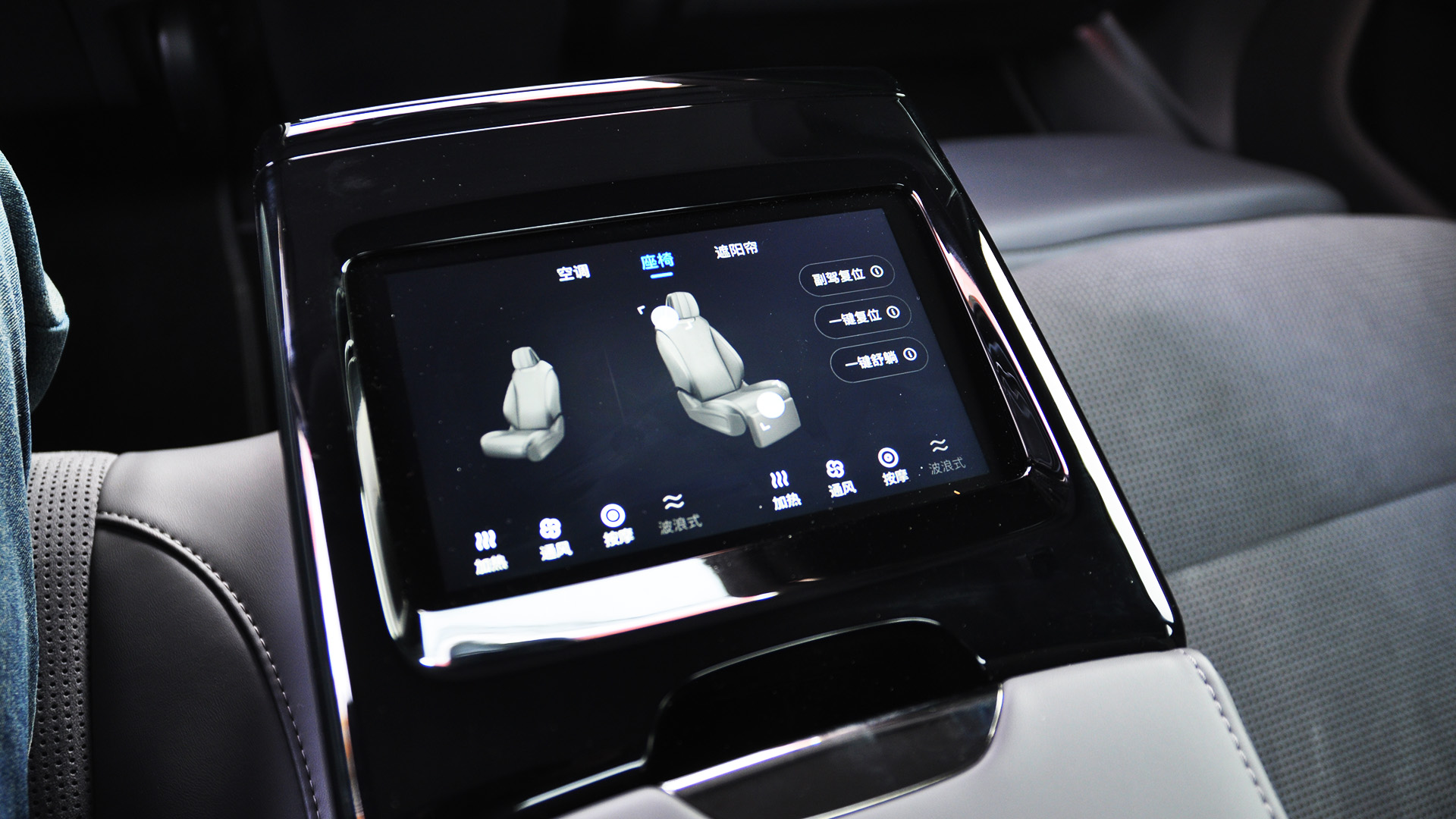Правое кресло — командирское. Электрическая оттоманка выезжает по команде с сенсорного экрана в подлокотнике. Жмём кнопку — и переднее сиденье ползёт вперёд, спинка откидывается, ты полулежишь, как в бизнес-классе. Подогрев, вентиляция, массаж — всё есть и слева, и справа. Роскошь! Но чтобы понять, как включить массаж конкретно этой ягодице, придется поэкспериментировать. Интерфейс пульта — снова китайский. Метод тыка работает, но осадочек, повторюсь, остаётся.