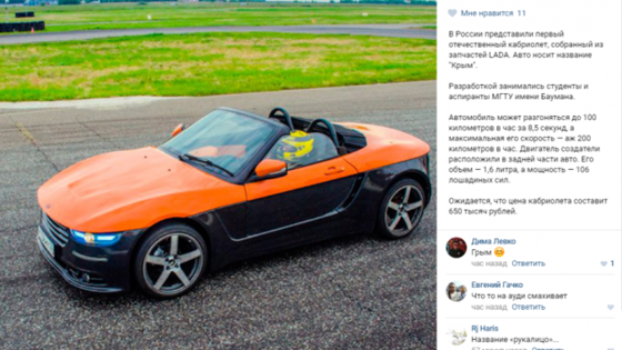 В настоящее время дизайнеры родстера «Крым» работают над созданием трех его версий: VIP, средней ценовой категории и бюджетной. По словам конструкторов, «Крым» можно сравнить с гоночным болидом, поскольку двигатель автомобиля размещен перед задней осью, точно так же, как у Porsche Boxster и Lotus. Кабриолет весит в среднем 800−850 кг, а базовая комплектация для топовой версии предполагает массу до 950 кг. Предполагается, что обслуживание машины будет бюджетным, поскольку она создана на базе LADA Kalina, сообщает телеканал «Звезда». Согласно информации, размещенной в соцсети «ВКонтакте», автомобиль будет стоить в пределах 650 тысяч рублей. Серийное производство «Крыма» может начаться уже в течение ближайших двух лет. Ранее «Ридус» писал, что первый российский кабриолет разработан студентами и аспирантами МГТУ имени Баумана, а его максимальная скорость может достигать 200 км/ч.