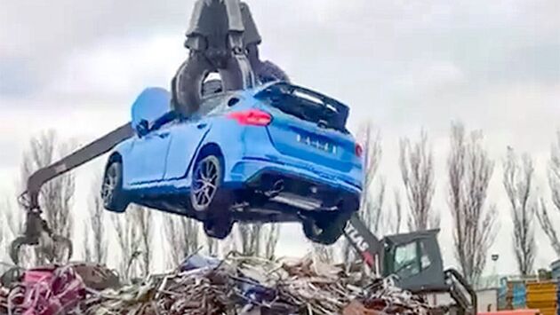 На видео запечатлен "заряженный" Ford Focus RS, который безжалостно утилизируют. Не сообщается, почему автомобиль постигла такая участь, возможно, он имеет криминальное прошлое, после которого его нельзя зарегистрировать либо продать.