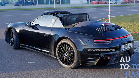 Кабриолет следующего поколения Porsche 911 с эффектным камуфляжем опять попал под прицелы камер во время тестирования при относительно невысокой температуре воздуха. С опубликованных изображений Porsche 911 2019 модельного года можно заменить обновленную оптику, более угловатые боковые зеркала, новый капот и дверные ручки. Поскольку этот прототип является кабриолетом, нельзя не подчеркнуть, что задний изгиб модели во многом напоминает предшественника, даже учитывая, что кузова автомобилей совершенно разные. Также, вполне возможно, что задние фары модификации имеют немного иное расположение, однако для подтверждения данной теории необходимо снять весь камуфляж с нового поколения Porsche 911. Помимо этого, если сравнивать предстоящий автомобиль, получивший название 992, со своим предшественником – будущий вариант имеет более длинную колесную базу, причем что общая длина машины остается неизменной. Некоторые технические и дизайнерские черты новинка перенимает у Panamera второго поколения, среди них новые дисплеи с большим разрешением и современная акустическая система. Ожидается, что полностью новый кабриолет Porsche 992 вместе с купе дебютирует в течении 2018 года.