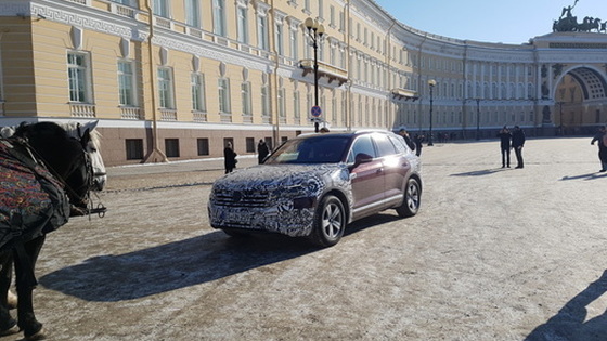 Подписчик АвтоВестей, пожелавший остаться неизвестным, прислал в редакцию фото и видео, на которых закамуфлированный Volkswagen Touareg нового поколения на немецких номерах раскатывает по Дворцовой площади в Санкт-Петербурге.