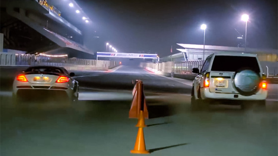 После этого машина пропала из виду. И вдруг вновь вернулась с тем, чтобы доминировать над спорткарами. В этот раз Nissan Patrol победил в состязании с Mercedes-Benz SLR McLaren и, судя по видео, это не доставило ему особых хлопот. Причина успеха кроется в глубоком тюнинге Nissan Patrol, а, главное в его двигателе. После работы механиков над движком от Nissan GT-R турбированный двигатель в 4,1 литра стал выдавать невероятные 1,800 лошадиных сил. Это позволяет скромному на вид внедорожнику обгонять на треке практически любой автомобиль.
