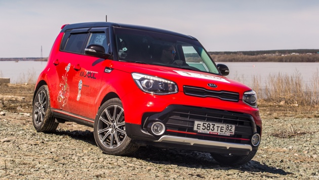 Этот KIA Soul (предоставлен официальным дилером компанией «Мегапарк»), кажется, только и создан для того, чтобы делать жизнь веселей, а настроение — лучше. Особенно в этой ярко-красной версии GT. Спереди он забавный, мультяшный — огромные кругляши противотуманок, маленький носик фальшрадиаторной решётки — всё это вызывает улыбку. Силуэт автомобиля наполнен квадратными решениями, главный акцент — рубленый стык крыши и передней стойки, оконный проём безо всяких закруглений. Верхняя линия окон немного ниспадает к хвосту автомобиля, придавая стремительности профилю. Видно, что заднюю часть долго придумывали и рисовали, а не просто сделали «по стандарту». Огромные фонари-ушки, чёрное обрамление стекла. Посреди всей этой черноты красная планка с названием модели — она как бы висит в воздухе. Картину довершают круглые красные фонари в бампере. Soul вроде бы и небольшой автомобиль, но почти как настоящий кроссовер — посадка высокая, и залазить сравнительно удобно. Компания KIA продаёт его в категории «Кроссоверы и внедорожники». Клиренс небольшой — 15,3 сантиметра, но короткая база (2,57 м) и умеренные свесы действительно делают машину относительно проходимой. Есть неожиданный простор и в салоне. Высокая крыша, много воздуха, передняя панель не скрадывает пространство. Пластик спереди мягкий, но уже сзади — жёсткий. Главная GT-деталь интерьера — эти вот динамики с красными ободками, похожие то ли на бочонки, то ли на барабаны. Это высокочастотники аудиосистемы. Красных GT-штрихов тут много: и прострочка, и различные вставки — на рычаге АКП, на центральном тоннеле. Ну и конечно, руль с прострочкой и срезанной нижней частью — баранка так и призывает к драйверской езде. Кресла должны были бы поддержать этот запал, но у них средненькая боковая поддержка, они не особо держат в крутых поворотах. Хотя сами по себе сиденья неплохие, с комбинированной отделкой кожа/ткань. Приборка простая и чёткая, с крупным дисплеем посередине. Кажется, что она расположена низковато, смотришь на неё как будто себе в ноги. Мультимедийная система — стандартный вариант без подвисаний, торможений, но и без особых изысков. Звучание акустики — в целом пойдёт, если прибрать средние частоты. На задних сиденьях места двоим хватит вполне, диван удобный, но нет подлокотника. Имеется подогрев кресел. Багажник, конечно, мал, всего 354 литра, но зато есть грамотная полочка, состоящая из двух сегментов, — её можно сложить и откинуть. В подполе объёмный органайзер. Под стать названию GT — под капотом здесь турбированный 1,6-литровый мотор, выдающий 204 «лошади». Разгон до сотни 7,8 секунды, но ощущения таковы, что динамика более скромная, а мотор и вовсе поначалу показался атмосферным. На автомобиле стоит роботизированная коробка DCT с двумя сцеплениями, работает она корректно, без подрагиваний. Иногда, при вдавливании педали газа, происходят толчки ускорения, но логика формирования этих толчков непонятна. Звуко- и виброзащищеность мотора могли быть лучше — на высоких оборотах в салон приходят и рёв двигателя, и зудящие вибрации. В спокойном же режиме до 3000 оборотов мотор не досаждает. Руль в околонулевом положении кажется немного ватным, при незначительных отклонениях баранки машина не меняет свой курс. Дальше уже руль становится более информативным, в поворотах он потяжелее, а курс автомо