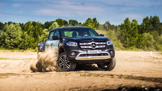 Этот пикап Mercedes-Benz X-класс (предоставлен официальным дилером «СТС-автомобили») в общем-то не полностью собственная разработка немцев. За основу взят японский Nissan Navara, немцы основательно переделали его кабину и ходовую часть, использовали множество собственных узлов и агрегатов. Спереди его морда огромна, и маленькие глазки-фары только подчеркивают это. Могучий капот, большая звезда — этот автомобиль кажется самым крупным из всех «Мерседесов». Сбоку прямые двери, наклон задней части кабины, небольшой взъём заднего стекла. Есть что-то родственное с японским предком. Сзади типовой пикаповский кузов, вертикальные фары-ушки, хромированные бамперы, хромированная звезда на чёрном фоне. В целом автомобиль получился интересным, особенно своей передней частью, мощным, брутальным. В салоне традиционная компоновка Mercedes, стандартный руль, но многие премиальные материалы исключены в целях практичности — здесь же будут лазить фермеры в грязных сапогах. Двери закрыты жёстким пластиком на две трети, только сверху небольшие полосочки кожи, зато с прострочкой. Особенность интерьера здесь — сдвоенные воздуховоды обдува. Все работает чётко, в руках приятно. Вообще, даже если Mercedes делает что-то простое, делает он это всё равно качественно. Над блоком климата расположена большая панель из жёсткого пластика, мало того что она мозолит глаза, так ещё и выглядит одиноко — сюда просятся какие-то приборы или органы управления. Подлокотник слишком сильно сдвинут назад, и пользоваться им неудобно. Замшевые кресла с кожей по бокам довольно комфортны, имеют электропривод и регулировку поясничного подпора. Из привычного «мерседесовского» оборудования — приборная панель и экран мультимедиасистемы, управляемой при помощи джойстика. Сзади тесновато и придётся сидеть почти с прямой спиной. Есть свои дефлекторы обдува и электрические стеклоподъёмники. Длина пикапа — 5340 мм, сам он весит 2,2 тонны и способен взять на борт ещё тонну груза. Кузов по желанию можно оборудовать закрывающимися панелями. Начальный двигатель довольно слабоват, 2,3-литровый «реношный» дизель мощностью 190 л.с. С таким мотором пикап разгоняется до сотни за 11,8 секунды. Тяга во всем диапазоне стабильная, автомат работает чётко, но с небольшими тычками, педаль газа довольно отзывчивая. На шоссе X-класс может двигаться в заднеприводном режиме, есть соответствующий переключатель режимов трансмиссии. Идёт машина стабильно, шумоизоляция неплоха — слышен только лёгкий ветер да рокот дизеля. На бездорожье можно подключить передние колёса, заблокировать центр, включить понижайку — в таком режиме X-класс позволит пробраться куда-нибудь в глубь лесных зарослей за грибами и ягодами. Песчаную горку X-класс штурмует уверенно, хоть и с небольшого хода. Есть небольшой потенциал выбраться из колеи, если машина уже остановилась, но не села на днище. Сзади у автомобиля пружины, но создать комфортную подвеску для пикапа не получилось. Машина козлит, подпрыгивает и даже на асфальте передаёт в салон все ямки в виде мелкой тряски неподрессоренных масс. Возможно, под полной загрузкой автомобиль будет идти более стабильно и комфортно, а рама не станет так резонировать. Стоит X-класс от 2,9 до 3,4 миллиона рублей. Это несколько дороже, чем основные конкуренты: Volkswagen Amarok, Toyota Hilux или Mitsubishi L200. Но ведь всё-таки это Merc