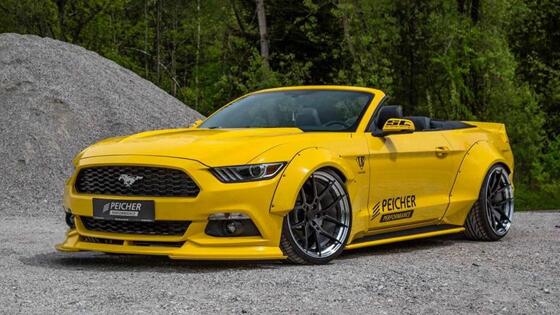 Благодаря стайлинг-пакету от австрийского тюнера, маслкар будет привлекать еще больше внимания. Не всякий автомобиль даже в стандартной версии вызывает такие эмоции как Ford Mustang, тем более, кабриолет, а если его еще одеть в эксклюзивный «костюмчик», то харизма такого автомобиля будет просто зашкаливать. Над этим конкретным экземпляром поработали в ателье Peicher Performance, установив на него комплект кузовного обвеса от японской фирмы Liberty Walk. В итоге мы получили действительно «кислотный» микс стороннего стайлинга и ярко-желтого окраса. Комплект обвеса включает задний диффузор, боковые юбки, передний спойлер, передние крылья, задний спойлер «утиный хвост» и, конечно, массивные расширители колесных арок. Новый дизайн, без сомнения, не всем придется по вкусу, но то, что это выглядит горячо, агрессивно, спортивно и даже гоночно, можно утверждать смело. Чтобы наполнить значительно располневшие колесные ниши, специалисты ателье укомплектовали кабриолет Mustang кованными дисками Yido Performance YP6.2 – 9,5×21 спереди и 12×21 сзади, обутые в резину Falken размерностью 255/30 и 295/25, соответственно. Также были установлены расширители колеи H&R и занижена подвеска с помощью коиловеров ST Suspension ST-XTA, инсталлированы стойки Steeda и выпускная система Remus с регулируемыми заслонками и распределительная труба Mishimoto. Все эти апгрейды были выполнены с европейской версией открытого Ford Mustang, оснащенного 317-сильной «четверкой» EcoBoost объемом 2,3 литра. Кстати, Ford Mustang довольно неплохо продается в Европе, например, в прошлом году было реализовано 13 241 таких спорткаров, а за полгода 2018-го объем продаж модели составил 5 357 машин. Недавно наш портал рассказывал про лимитированную серию 808-сильных Ford Mustang от Hennessey Performance. По материалам: www.kolesa.ru