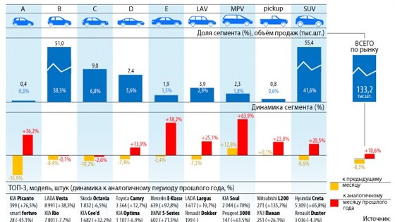 Объем рынка новых легковых автомобилей сегмента SUV в январе-июле 2018 г. составил в Москве около 63 тыс. единиц, сообщает аналитическое агентство «Автостат». «Согласно данным аналитического агентства «Автостат», по итогам семи месяцев 2018 г. объем рынка новых легковых автомобилей сегмента SUV в Москве составил порядка 63 тыс. единиц. Это эквивалентно 49% всего столичного рынка», - говорится в сообщении. Отмечается, что самым популярным кроссовером у москвичей остается Hyundai Creta, показатель которого за январь-июль 2018 г. достиг 4,5 тыс. экземпляров. Второе место в этом рейтинге занимает Volkswagen Tiguan с результатом около 3,5 тыс. машин. На третью позицию поднялся KIA Sportage (2,9 тыс. единиц), сместив на четвертую - Nissan X-Trail (2,7 тыс. единиц). Замкнул же пятерку лидеров Renault Kaptur (2,5 тыс. единиц). Кроме того, в топ-10 московского рынка SUV по итогам января-июля 2018 г. также попали: Mitsubishi Outlander (2,3 тыс. единиц), Nissan Qashqai (2,1 тыс. единиц), Toyota RAV4 (2 тыс. единиц), Renault Duster и KIA Sorento (по 1,9 тыс. единиц у каждой модели).