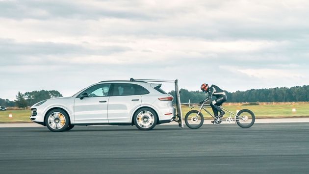 Британец Нейл Кэмпбелл установил новый европейский рекорд скорости, разогнавшись на велосипеде до 240 километров в час. Преодолеть сопротивление воздуха ему помог специальный аэродинамический щит, установленный на внедорожнике Porsche Cayenne Turbo. Велосипед для рекордного заезда, который состоялся на взлетно-посадочной полосе бывшего военного аэродрома в Элвингтоне, построила компания Moss Bikes. В его конструкции используется углеродное волокно и детали, напечатанные на 3D-принтере. Для стабильности на высоких скоростях велосипед получил растянутую раму и особые скоростные покрышки. Специальный щит, разгоняющий воздушный поток и создающий аэродинамический кокон, прицепили к Porsche Cayenne Turbo. Внедорожнику, оснащенному 4,0-литровым битурбомотором V8 мощностью 550 сил (величина момента — 770 Нм), предстояло разогнать Кэмпбелла до 177 километров в час. После этой отметки велосипедист отцеплялся от машины и самостоятельно набирал скорость. Все это необходимо было проделать на коротком отрезке, протяженностью чуть более трех километров. Видео: Porsche Управлял «Порше» чемпион Великобритании по дрэг-рейсингу Энди Фрост, который выступает на 4000-сильном драгстере Red Victor. «Разгон у Cayenne невероятный, — поделился своими впечатлениями Кэмпбелл после заезда, — ощущения были такими, будто меня прицепили к ракете». В мае Seat Ateca c аэродинамическим раструбом помог голландскому конькобежцу Кьелду Нейсу разогнаться на льду замерзшего озера в Лапландии до 93 километров в час. За рулем кроссовера сидела шведская гонщица Микаэла Алин-Коттулински.
