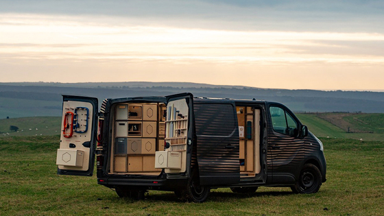 В кузове автомобиля разместились ящики для инструментов, материалов и личных вещей, компьютер с сенсорным дисплеем, пробковая доска, светодиодная подсветка интерьера и табурет, который перемещается по всему салону по специальным направляющим.