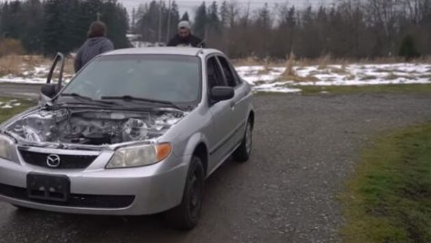 Парни из Life OD решили попытаться совершить замену двигателя автомобиля на газонокосилку Harbor Freight. После того, как из Mazda Protege вытащили двигатель, команда приступила к очистке моторного отсека, чтобы подготовиться к сварке. Затем они отправились в магазин, чтобы совершить покупку двигателя газонокосилки. Компания Harbour Freight предлагает несколько вариантов небольших одноцилиндровых двигателей с воздушным охлаждением. Они могут использоваться для питания чего угодно, от минибайка или картинга до газонокосилки или сплиттера. Выбрав один из более крупных вариантов, Predator 420cc, команда вернулась в магазин, чтобы договориться о подборе двигателя для своей несчастной Mazda. Predator 420cc производит 13 лошадиных сил и почти 27 Нм крутящего момента. Выходной вал двигателя был просверлен, что позволило ему скользить по входному валу автоматической коробки передач Mazda. Затем валы были сварены вместе. Удивительно, но маленький двигатель даже смог подняться в гору с тремя взрослыми внутри. Ликование умельцев было полностью оправданным.