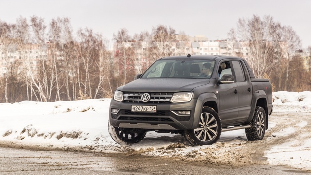 Немецкий пикап Volkswagen Amarok с 3-литровым турбодизелем — это такой могучий работяга, который может и позажигать как «гонка», и побаловаться с разгоном с места. 224-сильный дизель вывозит Amarok из сотни менее чем за 8 секунд, но это, конечно, не главное его предназначение. Тяговитый мотор поможет пикапу лучше справляться с тяжелыми грузами и прицепом, а на жестком бездорожье повысит шансы вылезти из трясины. Подробнее о достоинствах и недостатках немецкого пикапа — в тест-драйве редактора НГС.АВТО Дмитрия Косенко. Сначала экспресс-обзор основных параметров Volkswagen Amarok (предоставлен официальным дилером «Автомир»): Внешность Amarok, пожалуй, самая симпатичная среди основных пикапов-конкурентов, представленных на российском рынке. Но это пока мы вживую не видели обновленный брутальный Mitsubishi L200, который скоро появится в продаже. Amarok сочетает в себе мощь, стремительность и лаконичный дизайн кузова, при этом автомобиль не выглядит огромным вальяжным слоном. И тем не менее автомобиль нуждается уже в редизайне. Острая оптика и массивная радиаторная решетка в стиле последнего Touareg вдохнули бы в него новую жизнь. А что же у нас в салоне? Заглянем туда: Скромное убранство интерьера Volkswagen Amarok освежается кожаными сиденьями, небольшим количеством глянца и металлизированных вставок. И конечно, достойный руль — он у всех «Фольксвагенов» одинаков — аккуратный, с мягкой кожей, удобный в обхвате. А вот подогрев баранки «Амароку» не положен. Все пластики в салоне жесткие, даже передняя панель, — сказывается утилитарное предназначение пикапа. Но выглядят материалы более-менее. Туда же и небольшой экранчик мультимедиа — зачем работяге крупный дисплей, лишний раз отвлекать водителя? Впрочем, весь основной функционал система предоставляет. Кресла снабжены электроприводом и регулировкой поясничного подпора. Они довольно плотные с мощной боковой поддержкой — это не помешает в высоком пикапе, склонном к кренам. Задний диван плоский, и места тут немного. Но есть куда поместить ступни, а высокая крыша дает запас пространства над головой более кулака. Из удобств сзади только электростеклоподъемники, розетка на 12 вольт да этот вот подстаканник на полу. Пикап может взять на борт около тонны груза. Конфигурация кузова позволяет уместить здесь европалету, а длинномеры можно перевозить с откинутой крышкой. 3-литровый турбодизель V6 «Амарока» развивает 224 «лошади», а максимальный крутящий момент в 550 Н·м доступен с 1400 оборотов. С постоянным полным приводом 4MOTION наш «Амарок» может взять первую сотню за 7,9 секунды, но куда так носиться на груженом пикапе? Тем более что к особенностям дозирования тяги здесь надо привыкать. На утапливание педали газа до одной трети её хода дизель реагирует сонно, заставляя все время активнее работать акселератором. Более энергичные манипуляции с газом вызывают сравнительно неторопливый набор 3000 оборотов, и только потом автомобиль выстреливает с ощутимой тягой. Работа 8-ступенчатого гидротрансформаторного автомата здесь не заметна ни толчками, ни запаздыванием с переключениями. Все работает четко, автомат расторопно и адекватно повышает и понижает передачи. На бездорожье, в снежном плену тяговитый дизель и ватная педаль газа позволяют вам меньше срываться в букс и уверенно проходить преграды. В автомобиле доступна блокировка диффер
