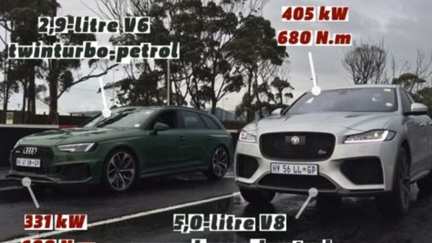 Агентство CarMag приняло решение проверить скоростные качества Jaguar F-Pace и «заряженного» Audi RS4 Avant. Во время заезда шел дождь, по этой причине заодно были проверены и полноприводные системы от британских и немецких автопроизводителей. Следует подчеркнуть, что обе машины имеют ряд одинаковых технических характеристик: они функционируют с 8-диапазонной автоматической КПП, которая передает крутящий момент на все четыре колеса. Немецкое авто оборудовано двигателем V6 на 2,9 литра производительностью 450 л.с., дающим возможность 2-тонному универсалу набирать 100 км/ч за 4,1 секунды. Как подчеркивается, британский автомобиль получил силовой агрегат с отдачей 550 л.с. Кроссовер приблизительно на 200 кг тяжелее конкурента и на 0,2 секунды медленнее разгоняется до 100 км/ч. Для уравнения шансов, в универсал сели 2 человека. По информации, четверть мили автомобили ехали «ноздря в ноздрю». Но такие состязания на мокром асфальте очень часто преподносят неожиданности.