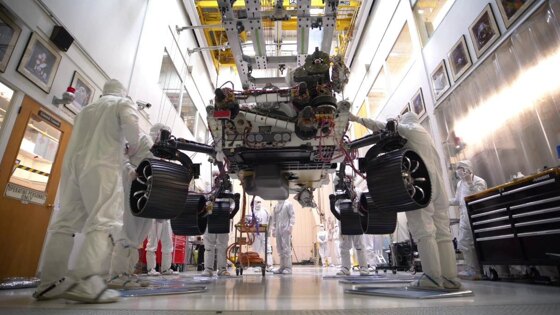 NASA опубликовало таймлапс-видео, демонстрирующее постановку марсохода Mars 2020 на его собственные шесть колес. Видео, как указывается, было сделано 8 октября текущего года в Лаборатории реактивного движения NASA в городе Пасадена, штат Калифорния. Как можно заметить, колеса ровера прикреплены к «ногам»; последние, согласно NASA, сделаны из титана, в то время как колеса выполнены из алюминия. В диаметре колеса составляют 52,5 сантиметра; указывается, что они являются инженерными моделями, которые будут заменены финальными образцами в следующем году. Каждое колесо имеет собственный мотор, причем два фронтальных и два задних колеса имеют также отдельные двигатели системы управления, которые позволяют машине разворачиваться на 360 градусов на месте. Как ожидается, новый марсоход NASA будет запущен с помощью ракеты Atlas V в июле 2020 года с космодрома на мысе Канаверал. Приземлиться же ровер должен будет 18 февраля 2021 года в кратере Джезеро. (На данный момент на Марсе работают два аппарата NASA — Curiosity и InSight.)
