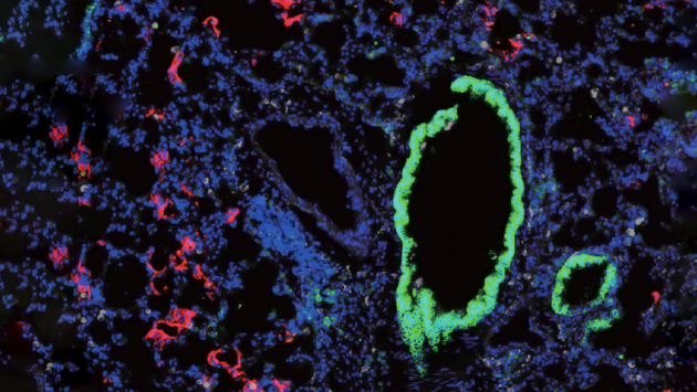 Несмотря на то, что мыши – самый распространенный модельный организм, масштабно спользовать их для изучения коронавирусной инфекции проблематично: SARS-CoV-2 не может воспользоваться рецептором ACE2 – «воротами» в клетку, так как его версия у грызунов отличается от человеческой. Исследователям из Йельской школы медицины удалось обойти эту проблему: они заразили мышей безвредным для них вирусом, «несущим» ген человеческого ACE2. Зараженные мыши производили уже именно эту версию (на фотографии выше зеленым) - коронавирус (красным) смог у них размножиться – и даже вызвать воспалительный ответ как у пациентов COVID-19