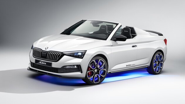 С 2014 года Skoda представляет студенческие концепт-кары — уникальные автомобили, созданные в единственном экземпляре выпускниками фирменной академии чешского автопроизводителя. Студенты под руководством действующих инженеров и дизайнеров марки разрабатывают проект дипломной машины, а затем с использованием мощностей Skoda и опыта сотрудников бренда строят реальный автомобиль. 7-м по счёту экземпляром стал спайдер Skoda Slavia. Модель названа в честь марки велосипедов, которые с 1895 года в чешском Млада-Болеславе выпускали основатели Skoda Вацлав Лаурин и Вацлав Клемент. В основу эксклюзивной машины лёг серийный бюджетный хэтчбек Skoda Scala. Автомобиль подвергся серьёзной доработке — у хэтчбека срезали крышу (мягкого или жёсткого съёмного верха у новинки нет в принципе), задние двери заварили, а вместо второго ряда кресел сделали металлический обтекатель, который также выступает в роли усилителя кузова. От кроссовера Skoda Kodiaq RS были взяты 20-дюймовые колёса, от Skoda Octavia RS — ступицы колёс и тормозные механизмы. Новинку окрасили в белый цвет White Crystal Blue, дополненный чёрными элементами Black Magic, а под днищем разместилась подсветка красного, синего и зелёного цветов в честь национального флага Чехии и фирменного цвета Skoda. В салоне появились обитые кожей кресла-"ковши" Sparco, дополненные 4-точечными ремнями безопасности. Белые декоративные элементы выполнили с помощью 3D-печати, а за спинками сидений появилось полотнище с вышитым львом, скрывающее динамики мощной акустической системы. Технически Skoda Slavia повторяет базовый хэтчбек и оснащается 150-сильным бензиновым турбомотором 1.5 TSI в сочетании с 7-ступенчатой роботизированной коробкой передач DSG. Привод остался передним, а подвеска и другие узлы модели не тронуты по сравнению со Skoda Scala.
