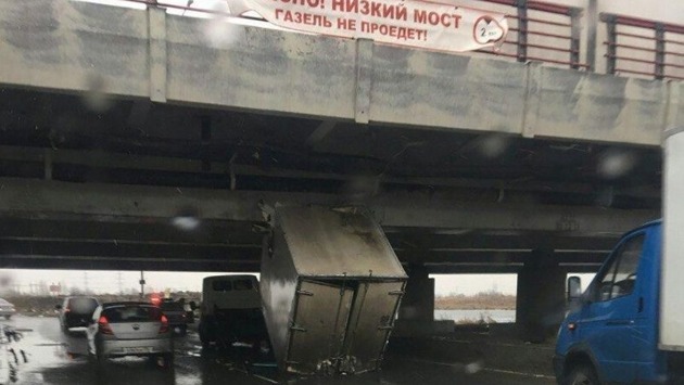 На днях там произошла 185-я авария, хотя она несколько выделяется на фоне прочих: на этот раз «мост глупости» поймал автомобиль с нагруженный прицепом, он-то и не прошел по высоте.