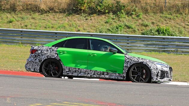 Заряженный седан Audi RS3 заметили на трассе Нюрбургринг. Секретные снимки опубликованы в издании «Autocar». Хоть об официальном запуске серии Audi RS3 Sedan еще неизвестно, журналистам удалось получить фотографии прототипа новой модели, снятой при первых испытаниях на трассе Нюрбургринг. За 4 секунды динамичный спорткар набирает разгон до 100 км в час, что на 0,5 секунды быстрее его предшественника- RS Q3. Увеличена будет, скорее всего, и максимально развиваемая скорость автомобиля- 280 км в час. Силовая установка в Audi RS3 Sedan будет представлена пятицилиндровым турбодвигателем мощностью в 400 лошадиных сил и объемом в 2,5 литра. На фотографии заметно, что в новом седане большие тормозные диски, колеса большого диаметра с покрышками низкого профиля. Новый спорткар выполнен в стиле усовершенствованных предшественников: RS4 Avant и RS6 Avant. Как полагают эксперты, дебют седана RS3 состоится в следующем году, как и выпуск хэтчбека этой серии.