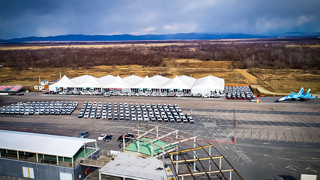 Машины, собранные на заводе СП «Мазда Соллерс» во Владивостоке, заполонили зону «ПримРинга» возле истребителя, и продолжают прибывать на автовозах. По словам представителей завода, скопление машин связано с плановым увеличением объемов сборки, под которое не успела подстроиться логистика.