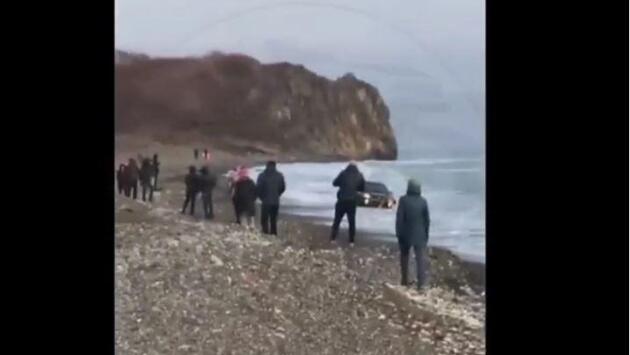 На кадрах видно, как джип то заезжает в море, то выезжает из него. При этом на пляже собралась толпа зевак.