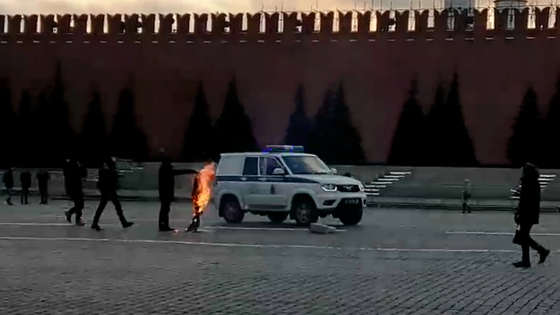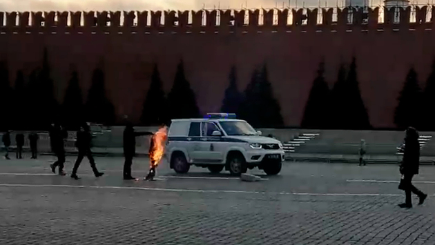 На кадрах видно, как человек в черной одежде, стоя на Красной площади, поджигает что-то похожее на тряпку и кидает на брусчатку. Рядом с ним припаркован автомобиль полиции.