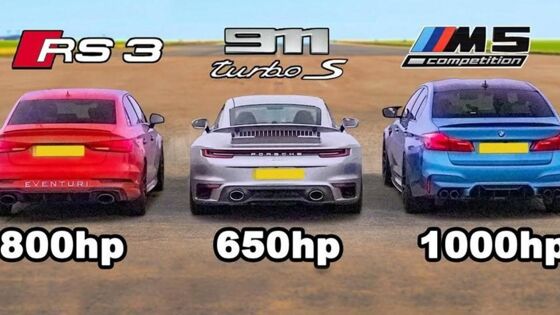 В Сети опубликовали новое видео, на котором представлено соревнование сразу 3 мощных автомобилей - Audi RS3, BMW M5 и 911 Turbo S.